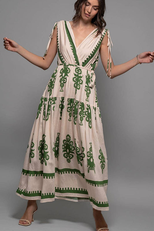 Green and Cream Embroidered Print Tie-Shoulder V-Neck Maxi Dress